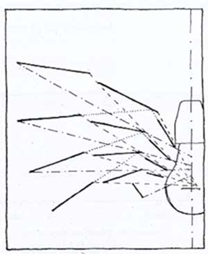 La radiación de la bombilla se divide en ángulos iguales y así los haces inciden en cada pantalla bajo el mismo ángulo. Cuando todas las pantallas reciben los rayos bajo un mismo ángulo se obtiene un sistema de pantallas regularmente creciente, en las que la luminosidad disminuye debido a la ley de la distancia.